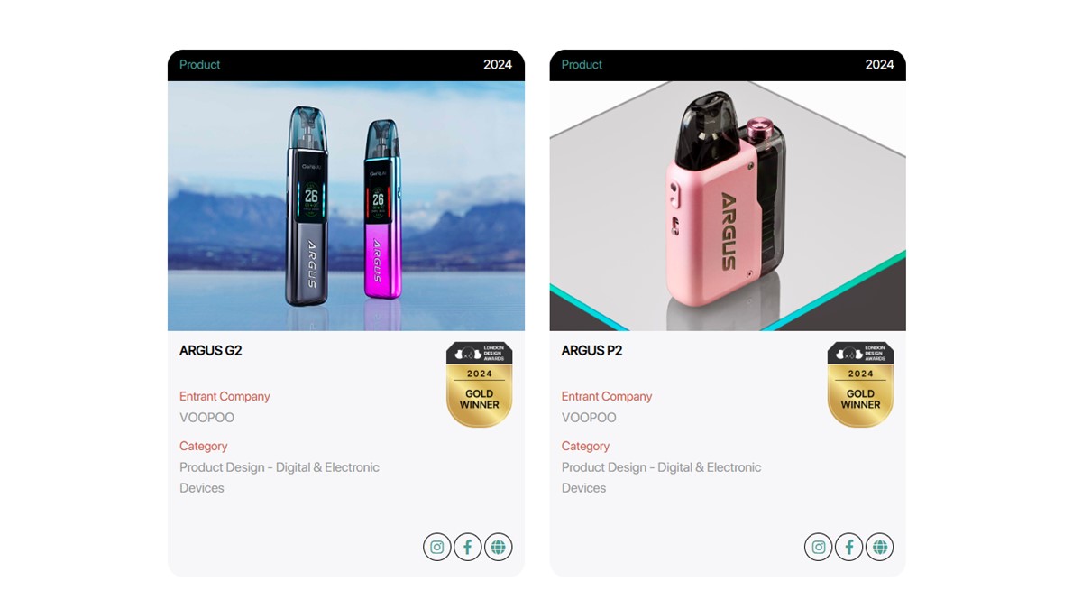 The ARGUS G2 and ARGUS P2 stood out for their cutting-edge aesthetics and advanced functionality, earning the Best Product Design Award. This recognition highlights VOOPOO's commitment to blending design excellence with high-performance vaping technology.
