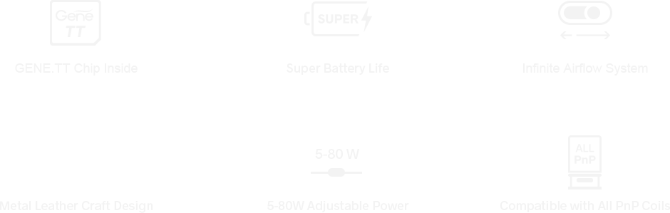 Rango de potencia ajustable de 5 a 80 W, satisface completamente tus diferentes necesidades.La bendición del chip GENE.TT le permite generar una gran nube en un instante.