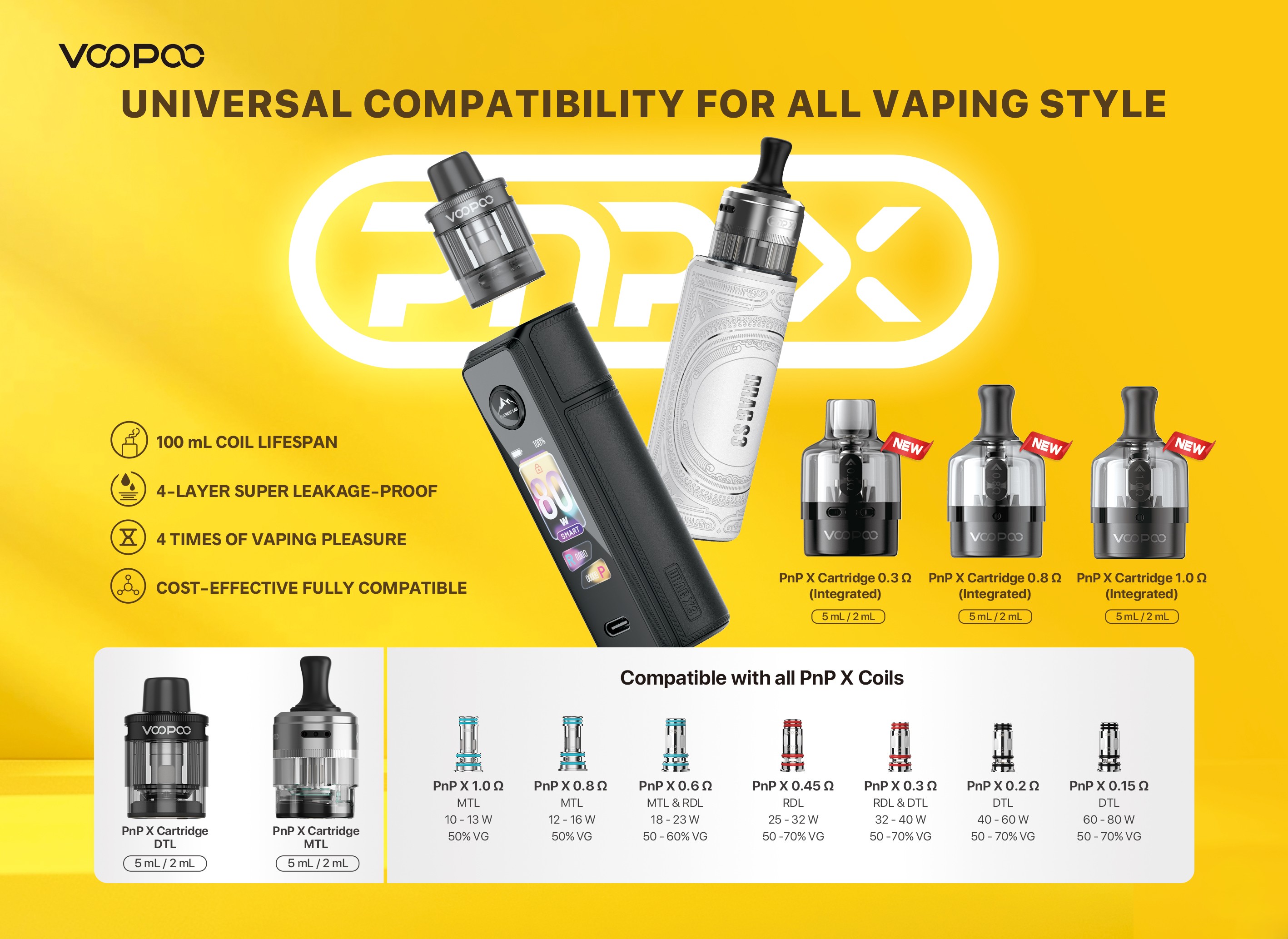 At the heart of both kits is the PnP X Platform, celebrated for longevity and flavor consistency. Each coil can deliver up to 100 mL of e-liquid before needing replacement, saving on long-term costs. The platform is fully compatible with a range of resistances (from 0.15 Ω to 1.0 Ω), supporting both MTL and DTL vaping. This flexibility ensures that users can easily switch between tight, flavorful draws and airy, cloud-rich sessions with a simple drip tip and coil swap.