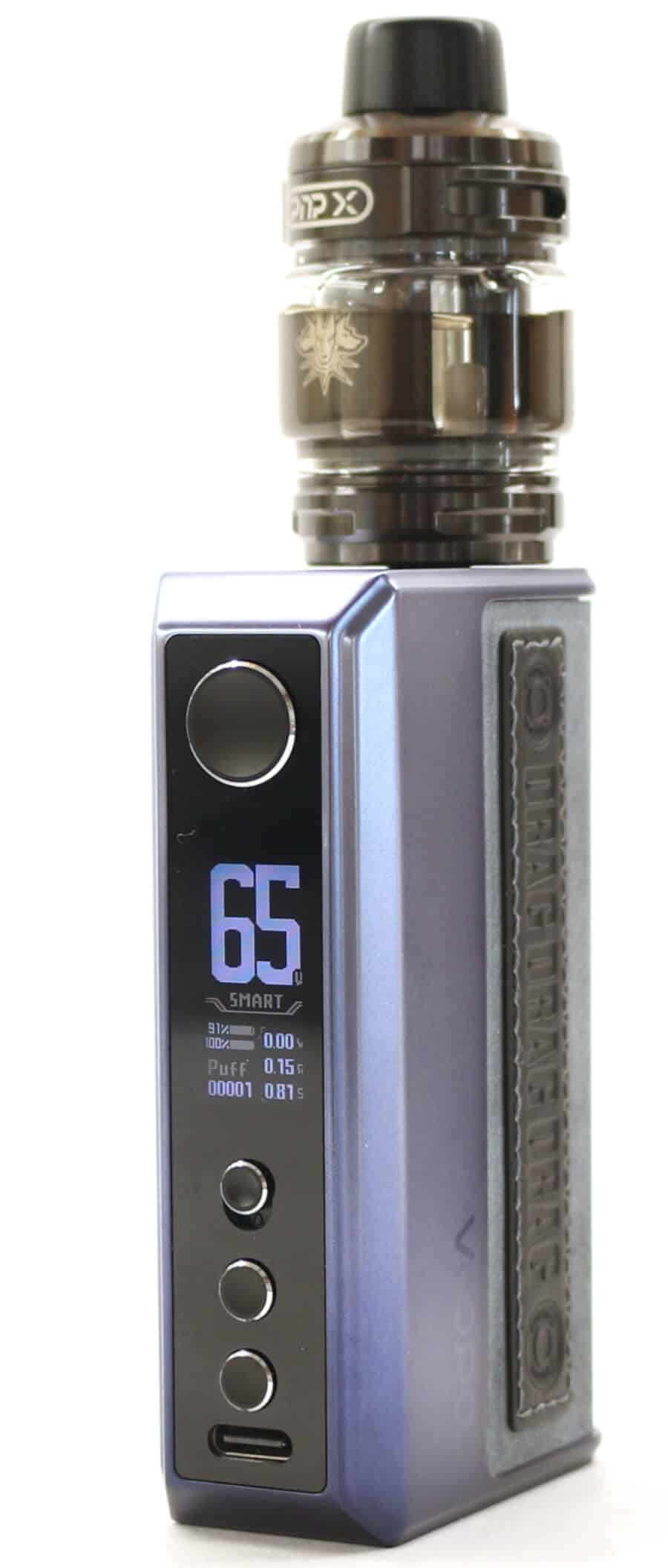 Manufactured from Aluminum Alloy with the now legendary leather 3/4 wrap around hide, the DRAG 6 packs some weight coming in at 280 g and feels incredibly robust. A Super-fast 3 A Type-C USB charging port is concealed behind a flush fitting rubber flap on the front panel below the display and will fully charge the device in approximately 80 minutes.
