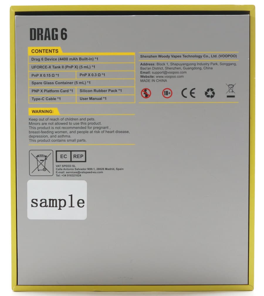 The DRAG 6 kit comes in a large packaging box and measures 144 mm x 123 mm x 42.4 mm. It has a lift off top lid, that following VOOPOO's re-branding, is now colored yellow with the famous "00" chain link from the VOOPOO name printed in silver lettering.