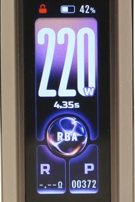 The DRAG 6 mod is powered from an internal 4400 mAh capacity battery and is a full feature box style mod with a maximum output power of 220 W. Its operating modes include Smart (auto coil detect), RBA (variable wattage) and Temperature Control with 4 pre-set wire types.